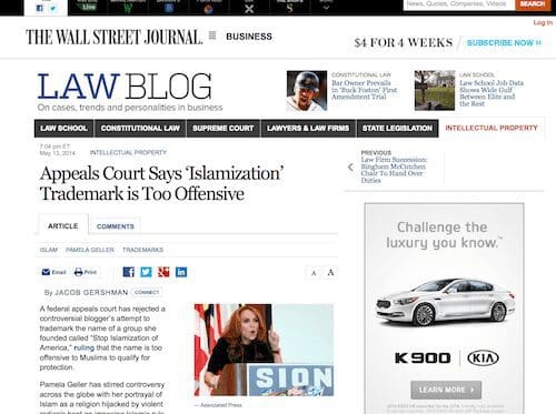 “Appeals Court Says ‘Islamization’ Trademark is Too Offensive,” Jacob Gershman,Wall Street Journal, May 13, 2014