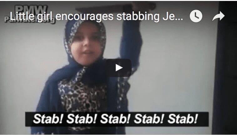 [the_ad id=”72852″]The following are examples of social media murder promotion by Palestinians on Facebook.One video (see above) shows a little girl glorifying stabbing. She is asked:Man: “What do you tell [Palestinian] youth in the West Bank?”Girl demonstrates with a long knife: “Stab! Stab! Stab! Stab! Stab!”[Facebook page of the Jerusalem Intifada’s Young People Coalition,