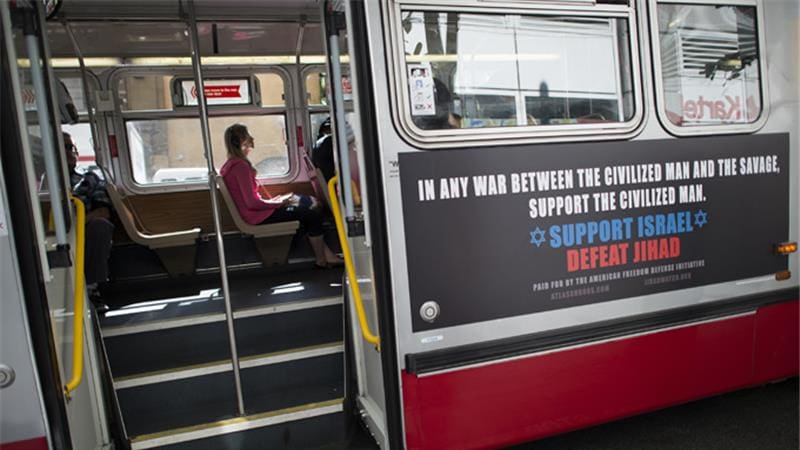 An advertising campaign by the American Freedom Defense Initiative is seen on the side of a Muni bus August 14, 2012/