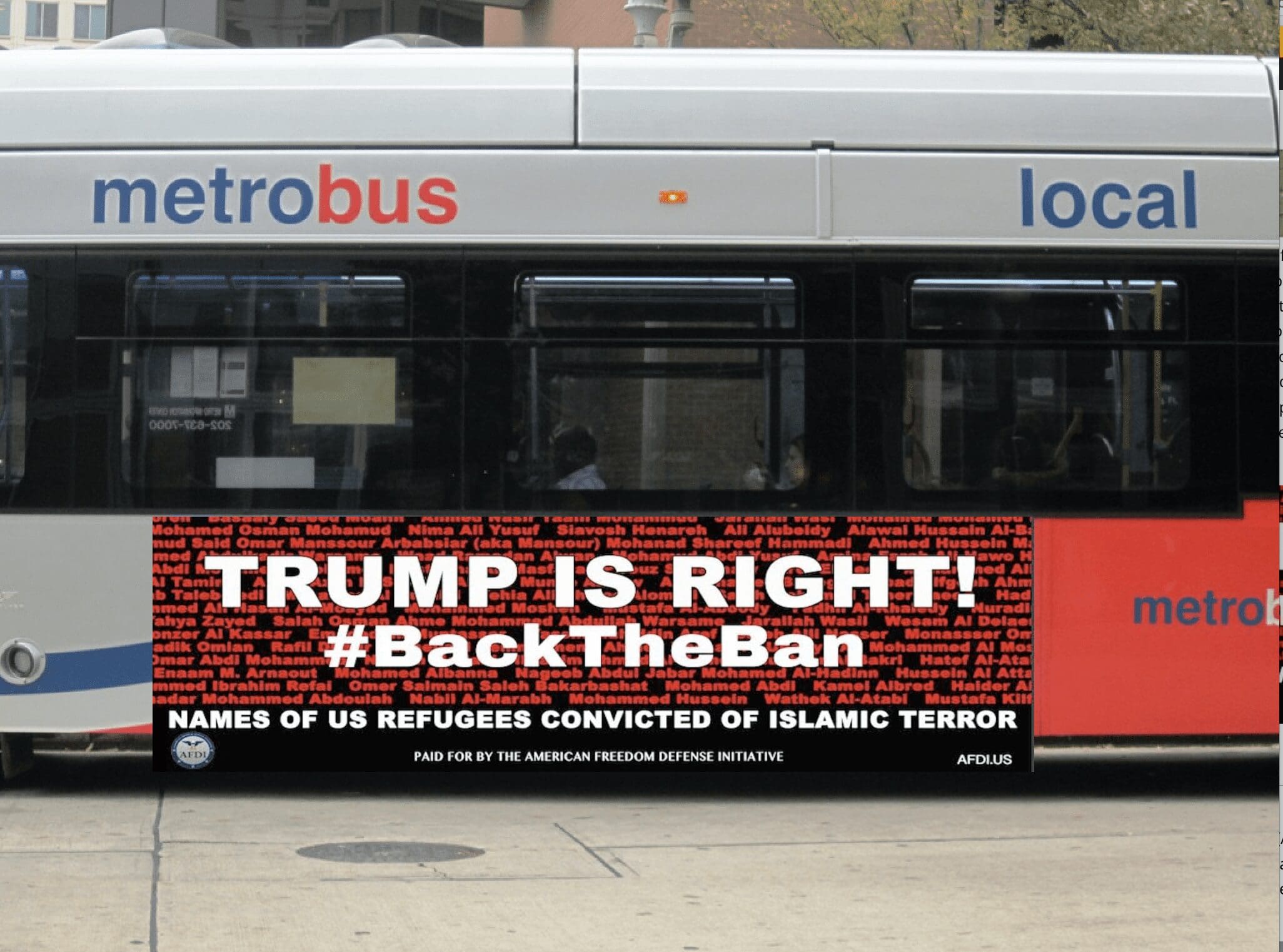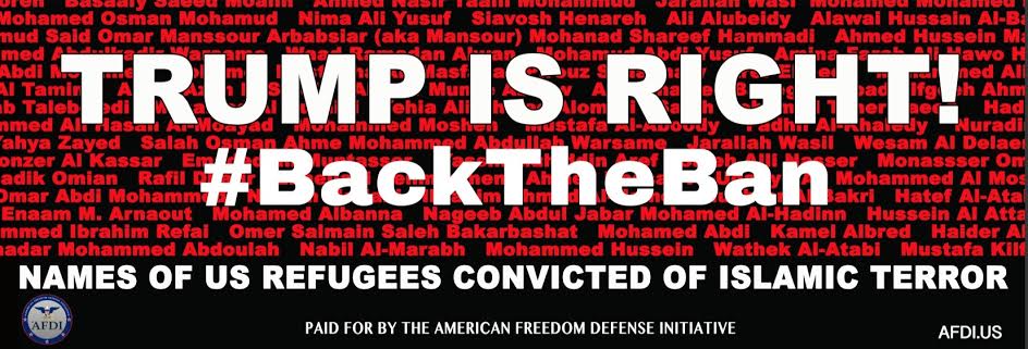 The ad merely calls for support of Trump’s immigration ban and runs the names of refugees into the US who have been convicted of Islamic terror, and we intend to run it in sanctuary cities across America where free speech has not yet been banned. Sadly this is an ever-increasing number — New York, Washington DC, Boston, Miami, Chicago have all banned “political” and “cause related” advertising.