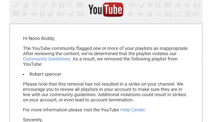 2. YouTube removes “Robert Spencer” playlist as “inappropriate”
