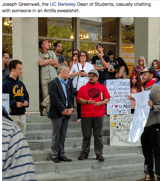 Milo: “I wish I had been able to speak for longer today, but a yelling protester made it impossible for any of our speakers to be heard (Berkeley refused to allow us any amplified sound), and Antifa showed up and I was told we had to evacuate”