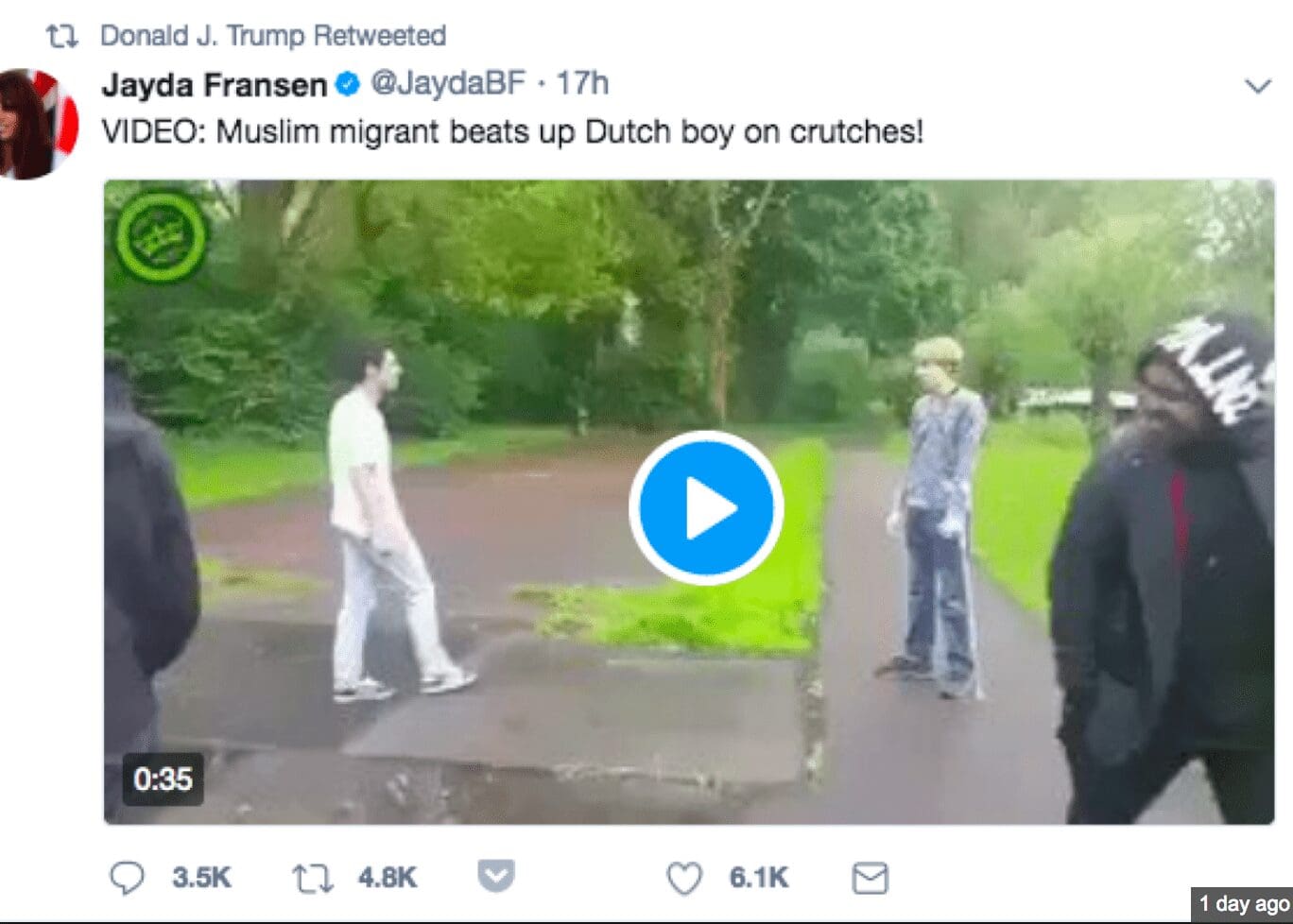 Fransen’s characterisation of one, however, “Muslim migrant beats up Dutch boy on crutches!”, does not describe what the film shows. Her captions for the other two mislead by failing to explain the circumstances in which they were