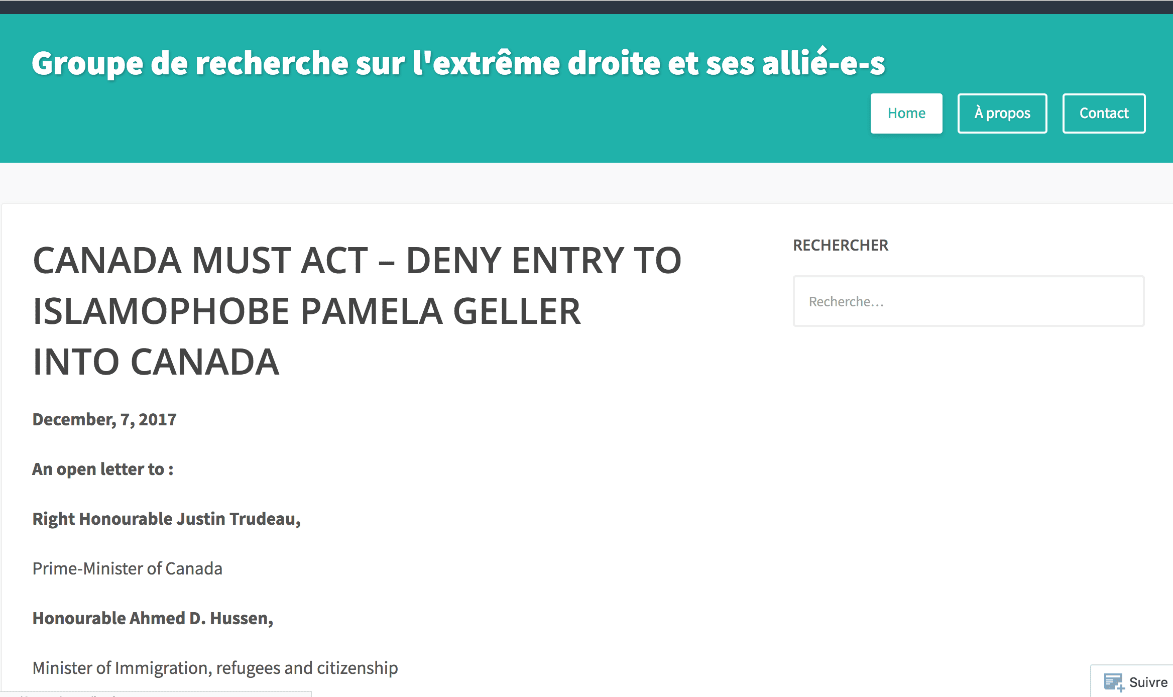 The Quebec-based Groupe de recherche sur l’extrême droite et ses allié-e-s is calling on the federal government to deny Geller entry into Canada for December 18 speaking engagement