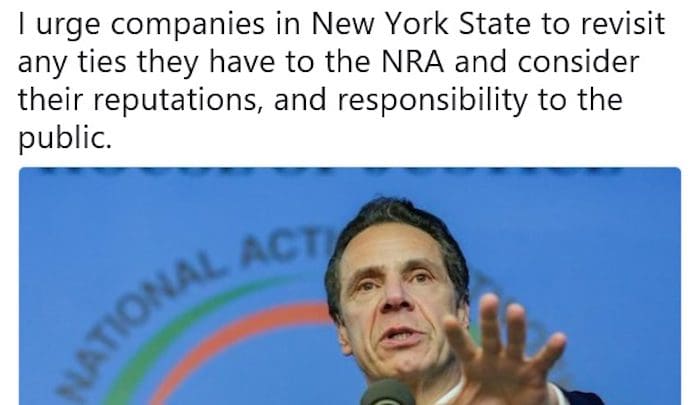 A fatwa (proclamation) has been issued by the State of New York against the National Rifle Association (and gun owners like you): “I urge companies in New York State to revisit any ties they may have to the NRA and consider their reputations, and responsibility to the public,” tweeted the Ayatollah Andrew Cuomo, aka the Governor of New York State. Conservative firearm advocates “have no place in the State of New York,” declared Ayatollah Cuomo.