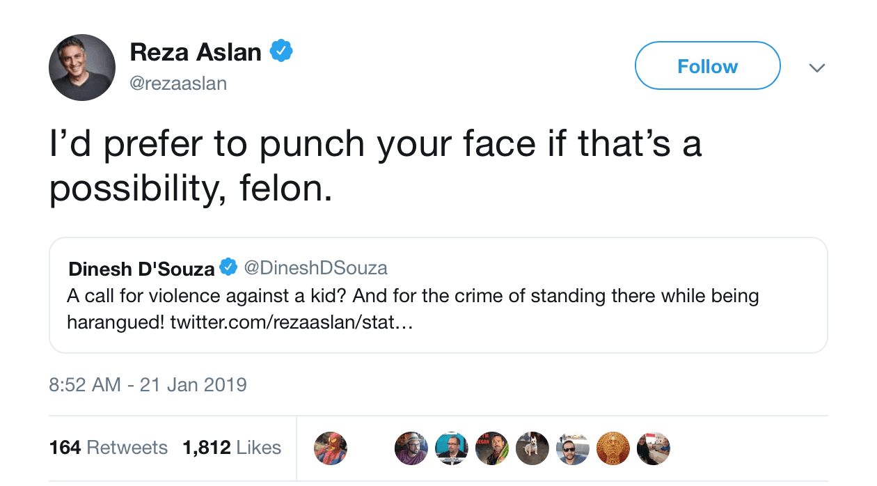 In a case of the the hunchback who can’t his own hunch, left-wing darling jihadi Reza Aslan is calling for violence and beatings against those who won’t submit to the oppression and subjugation of the left/Islamic (red/green) alliance. Wait, it gets better. His bio description on his twitter page is a quote from my from a post at Geller Report. Clearly it hit too close to home, because he added the exclamation point to make it sound comical. But it is still spot on, even with his edit.