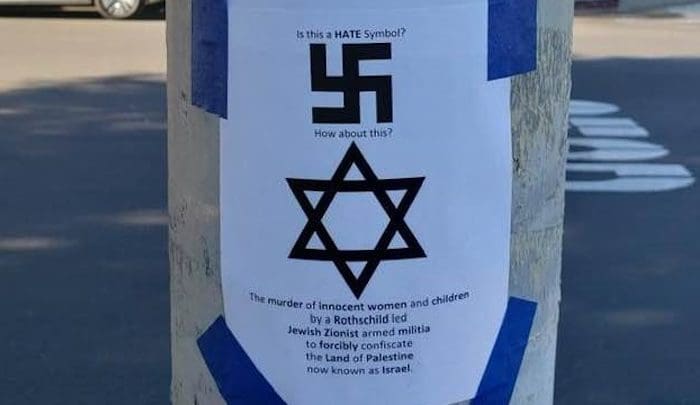 Another appeared to suggest that the Star of David was a “HATE Symbol” akin to a Nazi swastika, followed by the text, “The murder of innocent women and children by a Rothschild led Jewish Zionist armed militia to forcibly confiscate the Land of Palestine now known as Israel.”