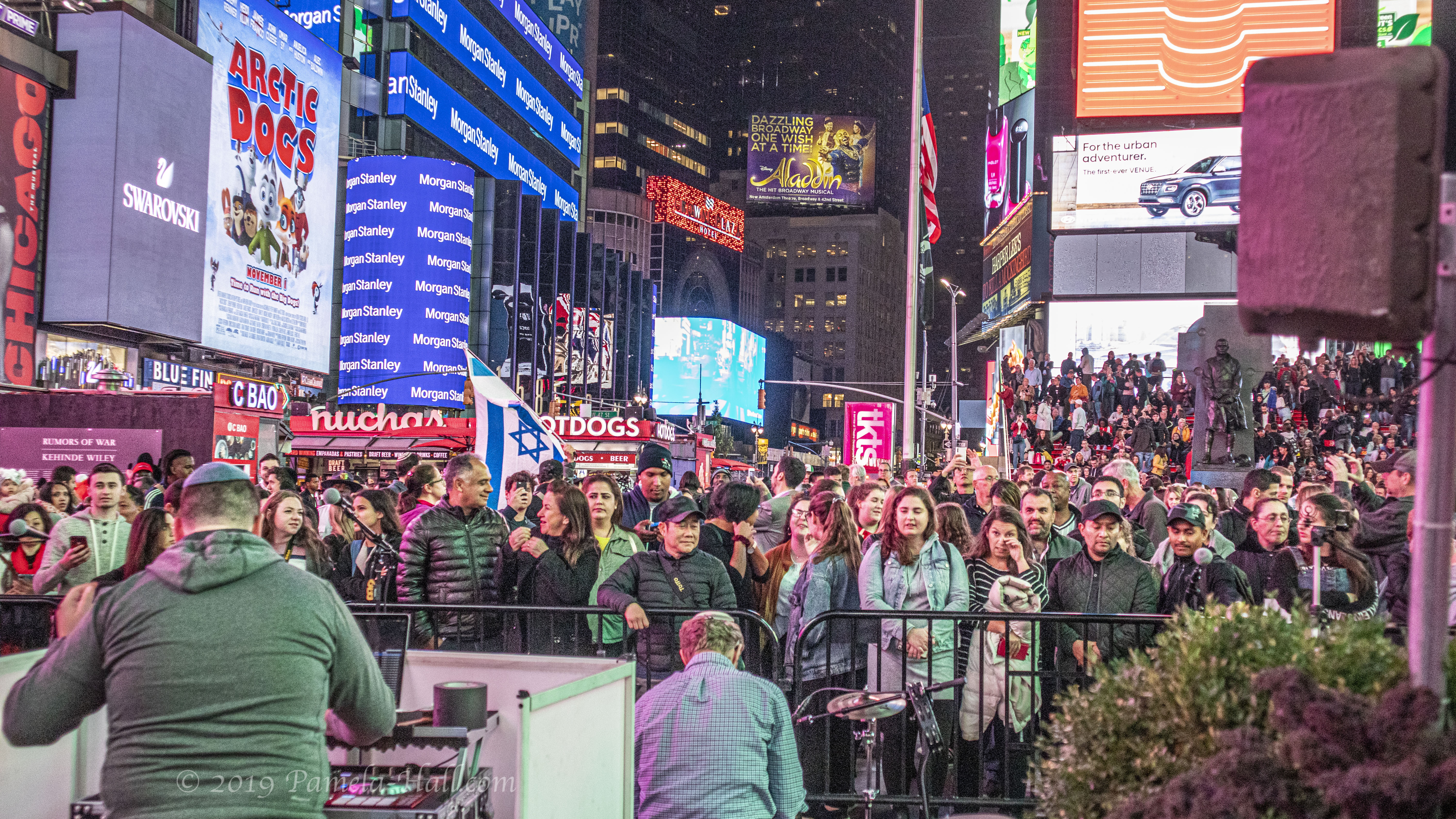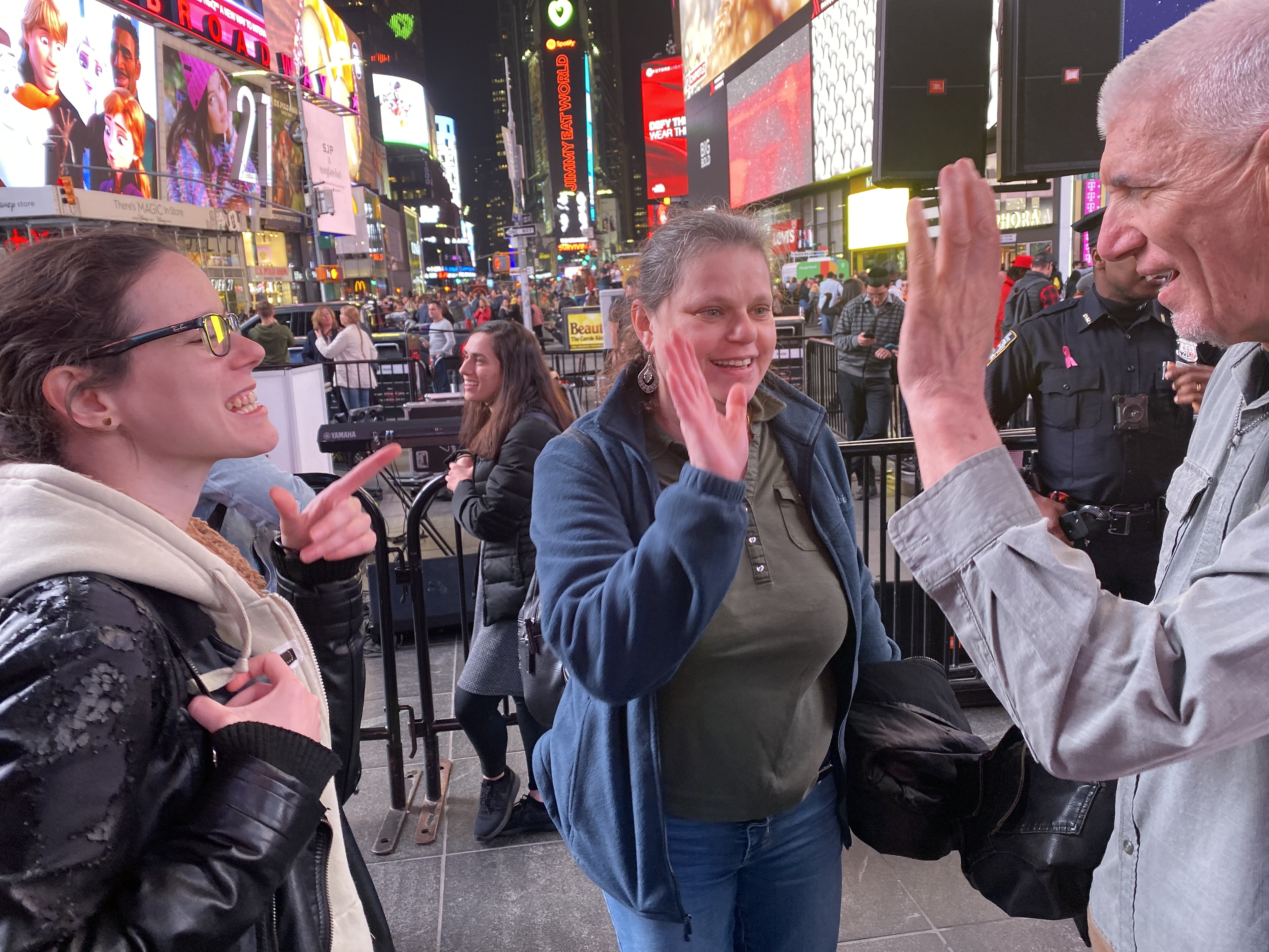 It was a busy night in Times Square. Commies in front of the Lunt and a short hop to the east – in Duffy Square- a Israel inspired kumzitz (they had a huge turnout) with joyful singing and dancing.