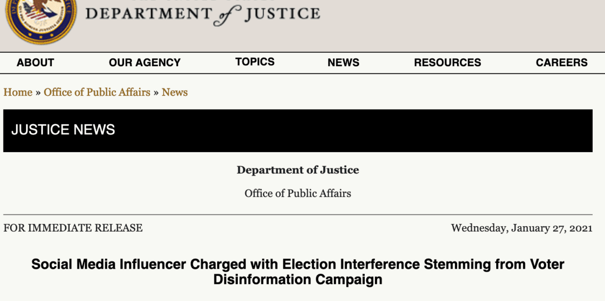 Social Media Influencer Charged with Election Interference Stemming from Voter Disinformation Campaign