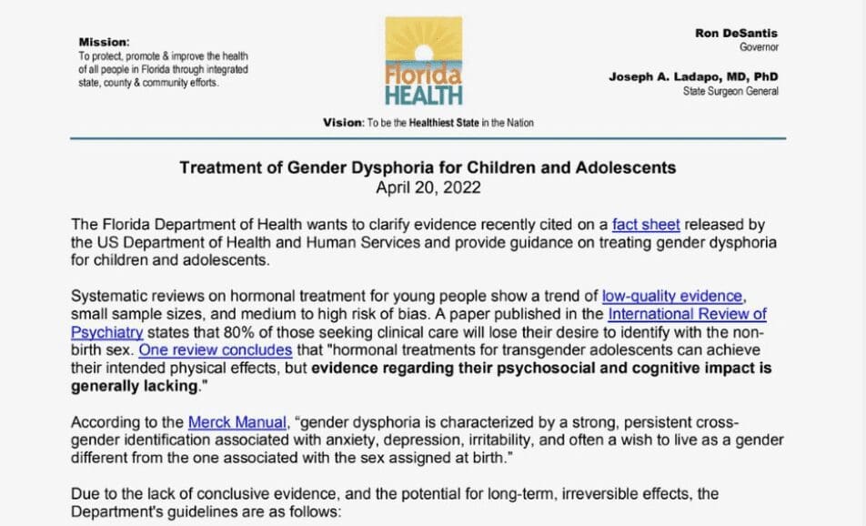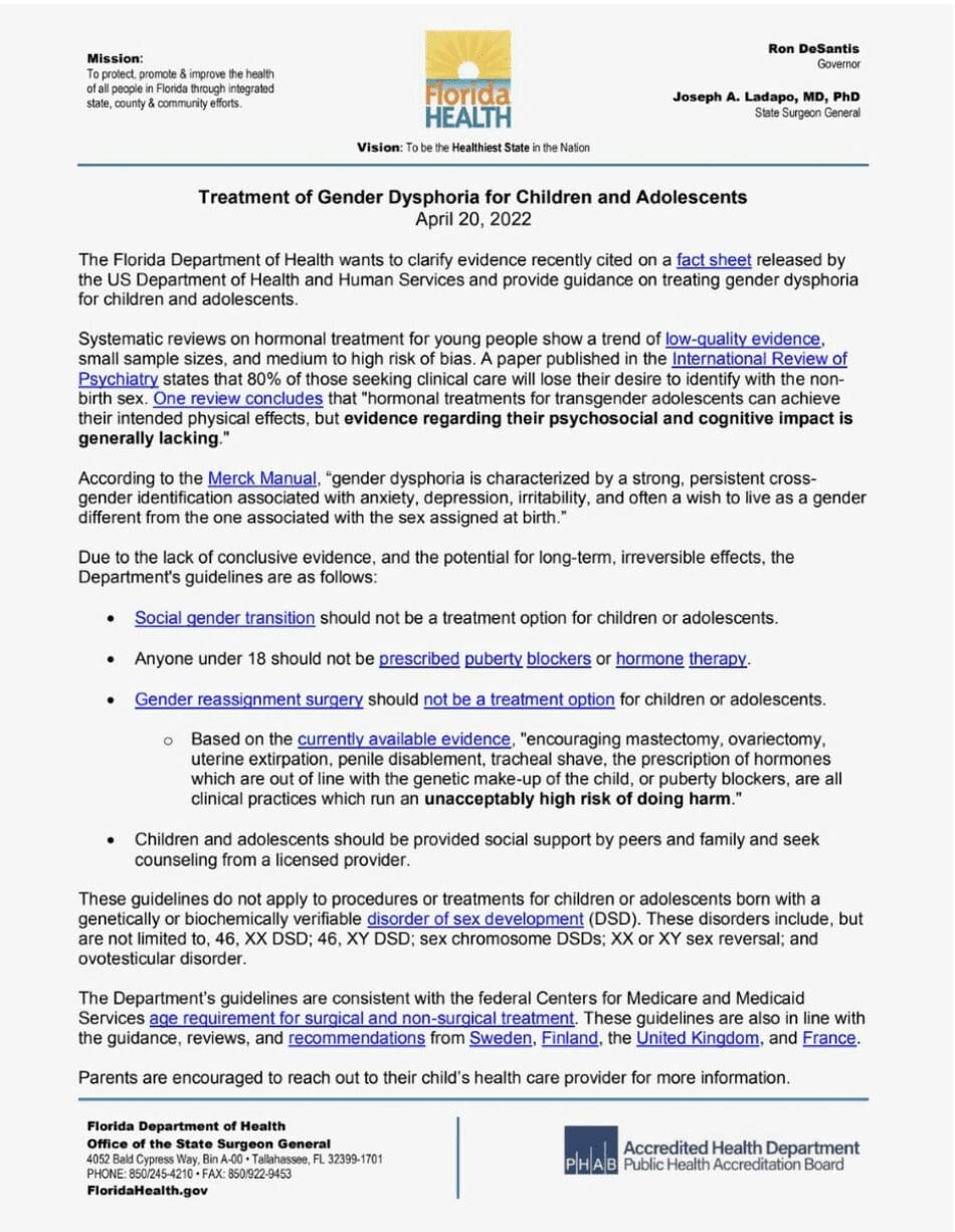 The great state of Florida Department of Health just issued very clear guidelines against transitioning of children with hormones or surgery.