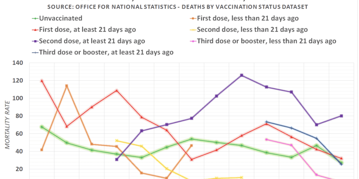 ADVERTISEMENTOfficial figures published by the UK’s Office for National Statistics show that deaths per 100,000 among double vaccinated 18-39-year-olds were on average 91% higher than deaths per 100,000 among unvaccinated 18-39-year-olds between January 2021 and January 2022.