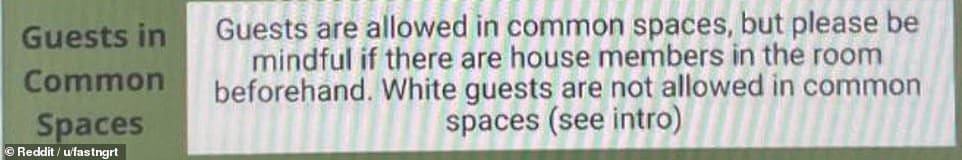 While the student house aims to have an ‘inclusive’ environment, the rules specifically state ‘white guests are not allowed in common spaces,’ according to the list, which was posted on Reddit.