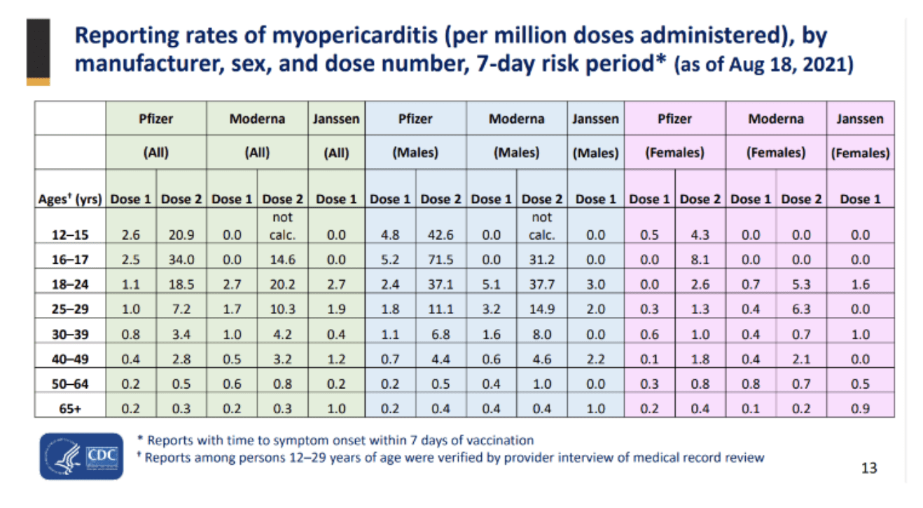 For instance, in August last year, the CDC reported 42.6 per million cases and 71.5 per million cases for 12-15 and 16-17-year-old males, respectively, but now the health agency admits those incidence rates are actually 150.5 per million for the younger group and 137.1 per million for the older. Among 16- and 17-year-old males, the incidence rate jumps to a whopping 188 per million following the first booster, with 9 of the 47,874 developing heart inflammation in the week after that shot.