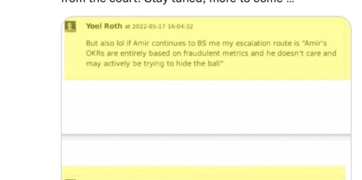 In the screenshot, Twitter’s Global Head of Safety & Integrity Yoel Roth suggested that he would imply a Twitter personnel named Amir used “fraudulent metrics” to report objectives and key results (OKRs).