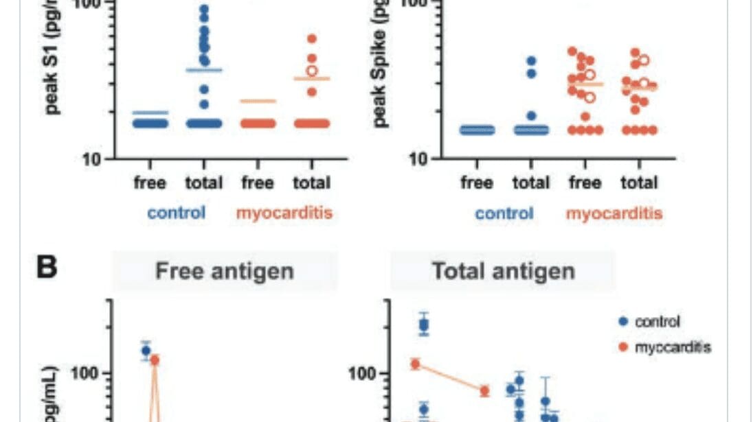 The peer-reviewed study in Circulation reviewed 16 adolescents and young adults hospitalized at Massachusetts General Hospital or Boston Children’s with post-vaccination myocarditis from January 2021-February 2022. All had “markedly elevated levels of full-length spike protein” in their blood, “unbounded by antibodies.’