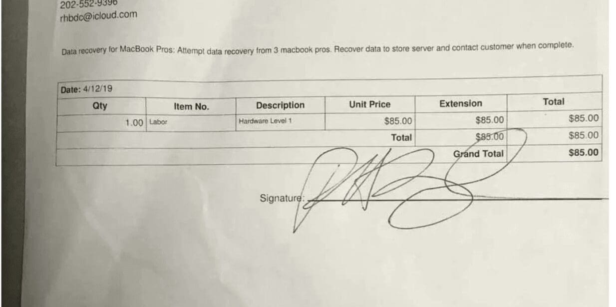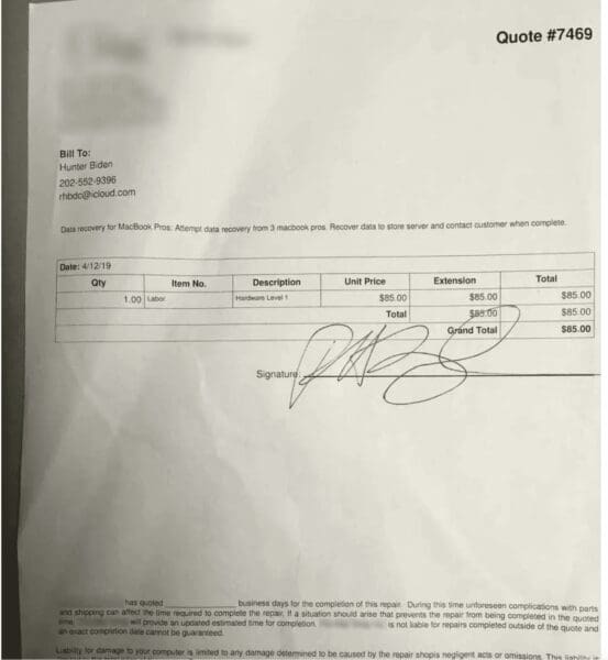 The contract (work order) between Hunter Biden and Delaware computer store owner J.P. Mac Isaac. Behind the redacted (blurred) text is J.P. Mac Isaac’s name.