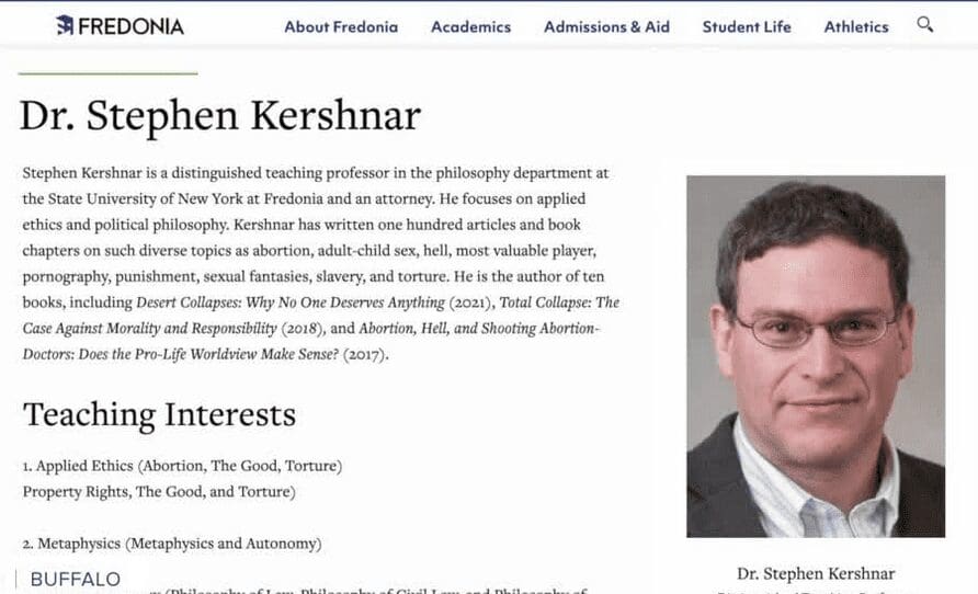 The comments were made by Dr. Stephen Kershnar “a distinguished teaching professor in the philosophy department at the State University of New York at Fredonia and an attorney,” according to his faculty page on the SUNY Fredonia website.