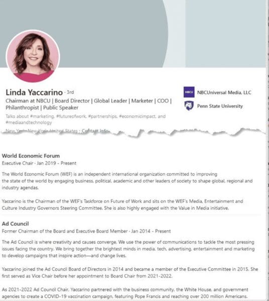 Additionally, Linda Yaccarino is the Chairwoman of the World Economic Forum’s (WEF) Taskforce on Future of Work. As she noted in her position, “every CEO and executive needs to look inward, and build workplaces that ensure our employees, current and future, can always succeed amid rapid transformation.” Overlaying the Diversity Equity and Inclusion mindset, you will note Yaccarino says, “long-term benefits for the unemployed, women, and communities of color.”