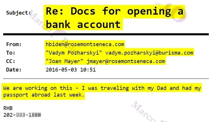 In May 2016, Burisma executive Vadym Pozharskyi informed Hunter Biden that he was opening him a Maltese bank account. Pozharskyi requested the documentation required for the account opening, including a copy of Hunter’s passport, a bank reference letter, and a utility bill.