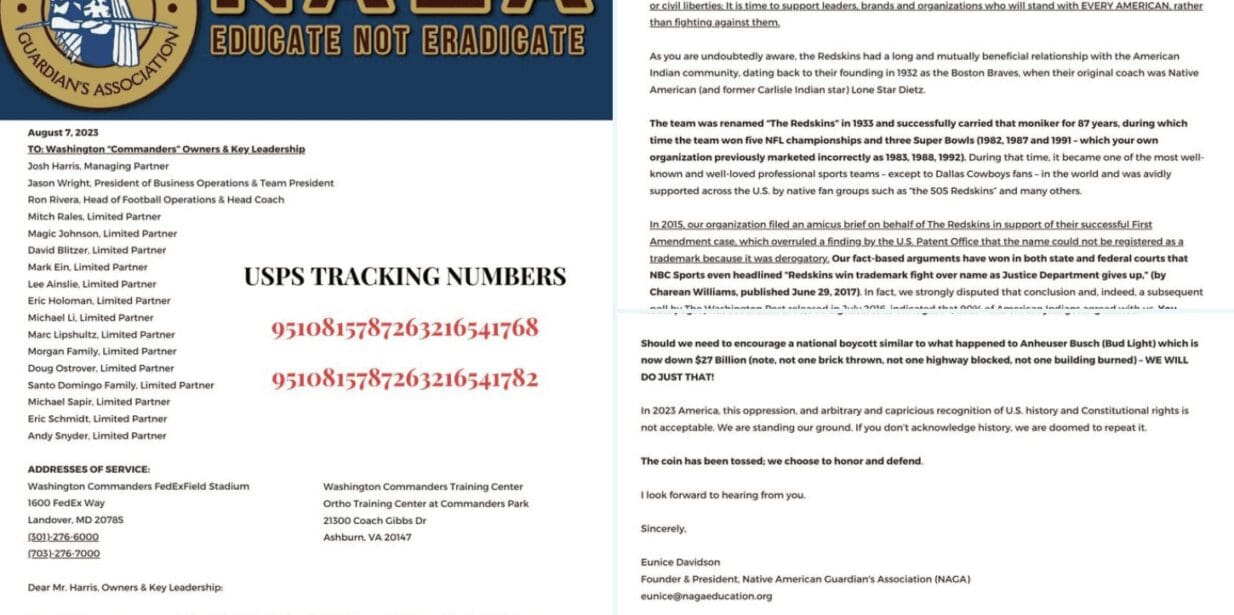 🚨BREAKING: Native American Guardian’s Association Founder & President Eunice Davidson Sent a Demand Letter Today to Washington "Commanders" Ownership & Key Leadership Formally Requesting The Team Revitalize it's Relationship With The American Indian Community & Rightfully Change… pic.twitter.com/cpau4hVq6H