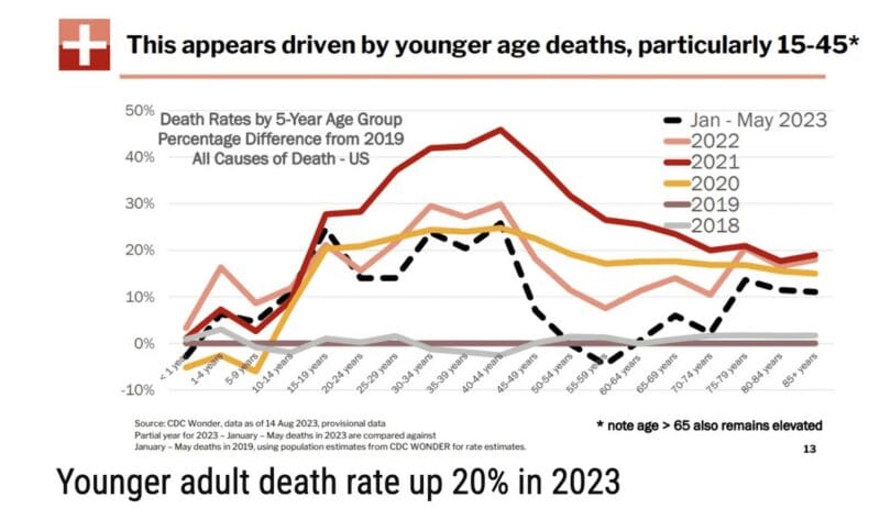 Particularly worrying were statistics from the CDC that showed mortality rates are still rising. For example, younger adult mortality rates are up more than 20% in 2023.