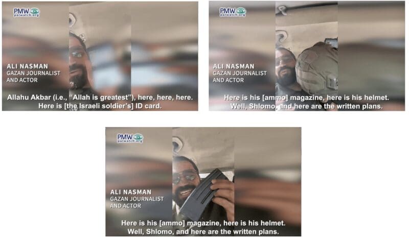 ADVERTISEMENTThis video shows Gazan journalist and actor Ali Nasman ecstatically celebrating the abduction or killing of an Israeli soldier, by displaying the soldier’s ID card, helmet and ammunition magazine, while he participated in Hamas’ massacre on October 7.