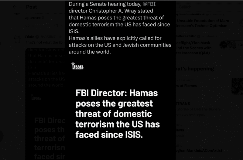 They’re now claiming that Trump supporters are more dangerous then #HamasNazi terrorists who beheaded babies, raped women, murdered 1,400 people including Americans, and burned people alive. These people are 🦇💩 crazy https://t.co/C3XLH3Zo0w pic.twitter.com/NRoTvjYCBQ