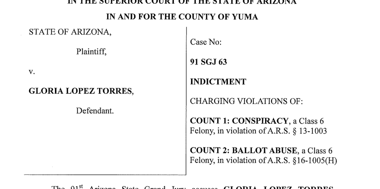 Torres and Nadia Guadalupe Lizarraga-Mayorquin a/k/a Nadia Buchanan were indicted in October 2022, on two Class 6 felonies of conspiracy and ballot abuse stemming from a two-year long investigation by the Arizona Attorney General’s Office with assistance from the Yuma County Sheriff’s Office.