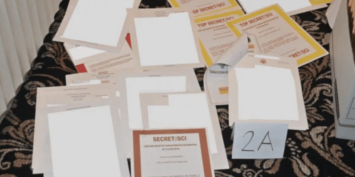 A few weeks after the armed FBI raid of Mar-a-Lago in August 2022, the Department of Justice released a stunning photograph depicting alleged contraband seized from Donald Trump’s Palm Beach estate that day; the image showed colored sheets representing scary classification levels attached to files purportedly discovered in Trump’s private office.