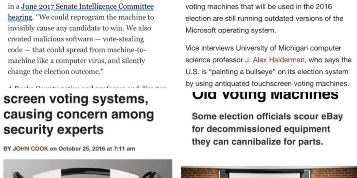 Electronic voting machines and anything mailed in is too risky.