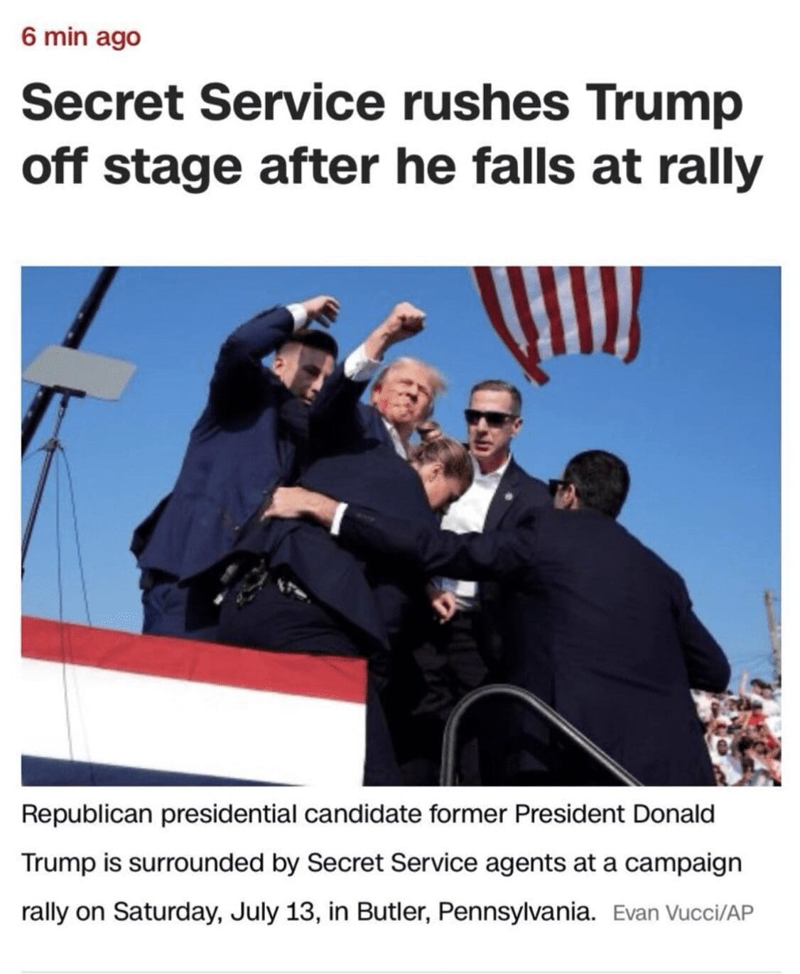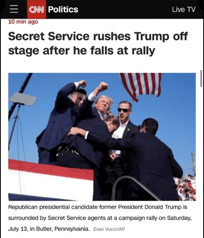 If you are reading regime Media like CNN + Washington Post, you believe Trump fell on stage because of loud noises