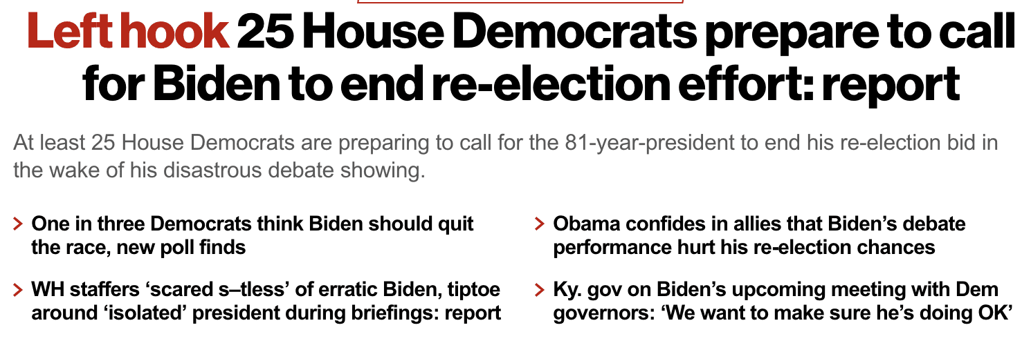 This a diabolical plot unfolding before our very eyes. Just to be clear, Biden has been non compos mentis for years. Years. Since hiding in his basement in 2020 and letting the Democrat medai axis do the heavy lifting. News sites like Geller Report have long been reporting Biden’s gaffes, falls, gibberish, handshakes with invisible people, aimless wandering, inability to exit a stage without help etc etc. There is nothing new in Biden’s behavior and his debate performance was classic Biden.