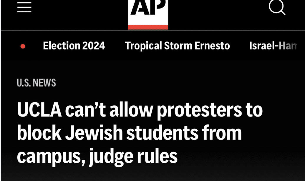 A federal judge just issued a preliminary injunction ruling UCLA can’t allow anti-Israel protesters to block Jewish students from accessing classes & other parts of campus. This is the FIRST time a US judge has ruled against a university over anti-Israel protests on campus. Question: Why was it necessary for Jewish students to bring a lawsuit against a PUBLIC UNIVERSITY to be able to get to class & walk on campus??? In response, UCLA claims that complying with the judicial ruling will harm the school. In an Orwellian comment, UCLA spokesperson Mary Osako said, The ruling “would improperly hamstring our ability to respond to events on the ground and to meet the needs of the Bruin community,” before adding, “UCLA is committed to fostering a campus culture where everyone feels welcome and free from intimidation, discrimination, and harassment.”