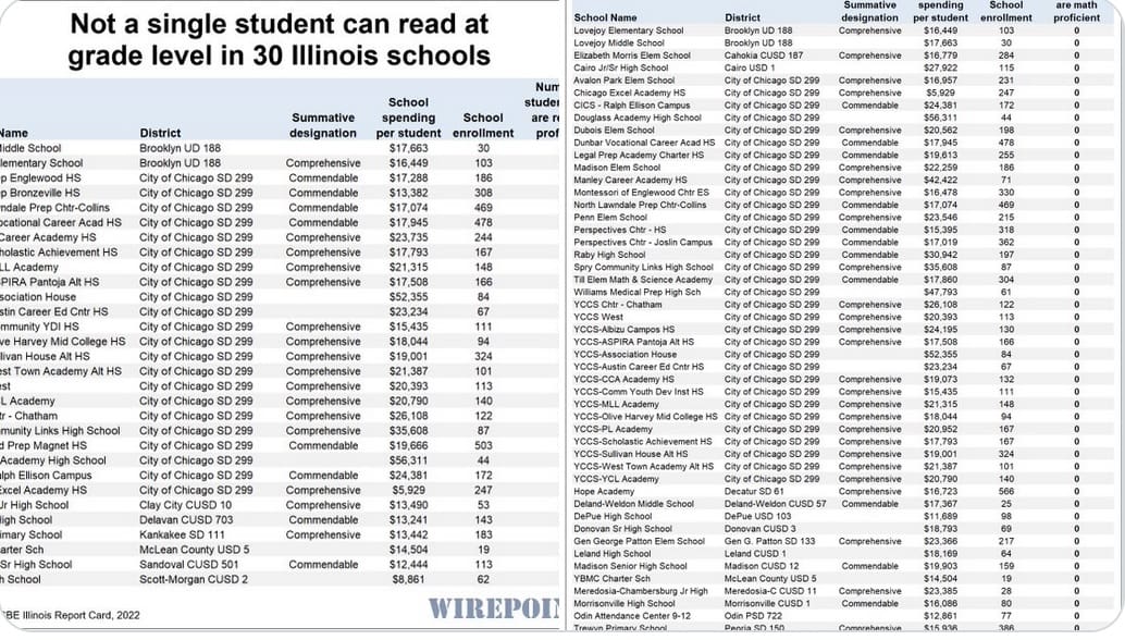 Meanwhile not a single student can read at grade level in 30 Illinois schools.