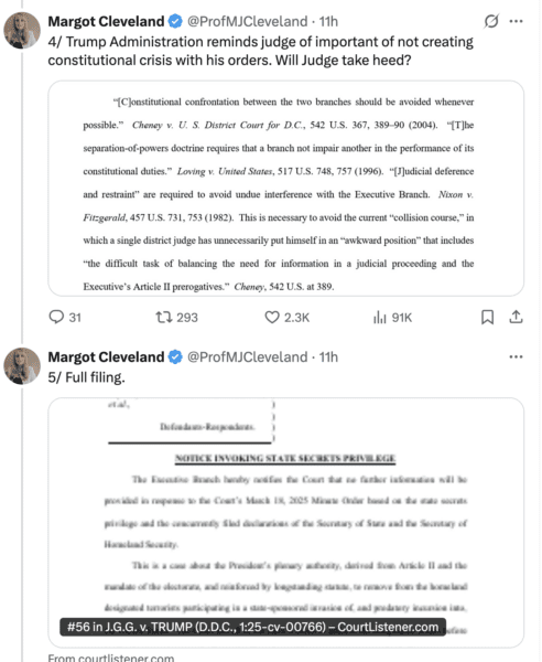 Trump Administration tells Judge in Alien Enemies Act case it will provide him no more information re the flights etc. and is exercising the State’s Secret doctrine