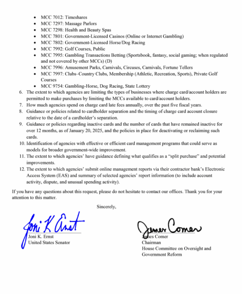 In a letter addressed to Comptroller General Gene Dodaro, Ernst and Comer called on the Government Accountability Office (GAO) to launch a comprehensive review of all federal charge card programs.