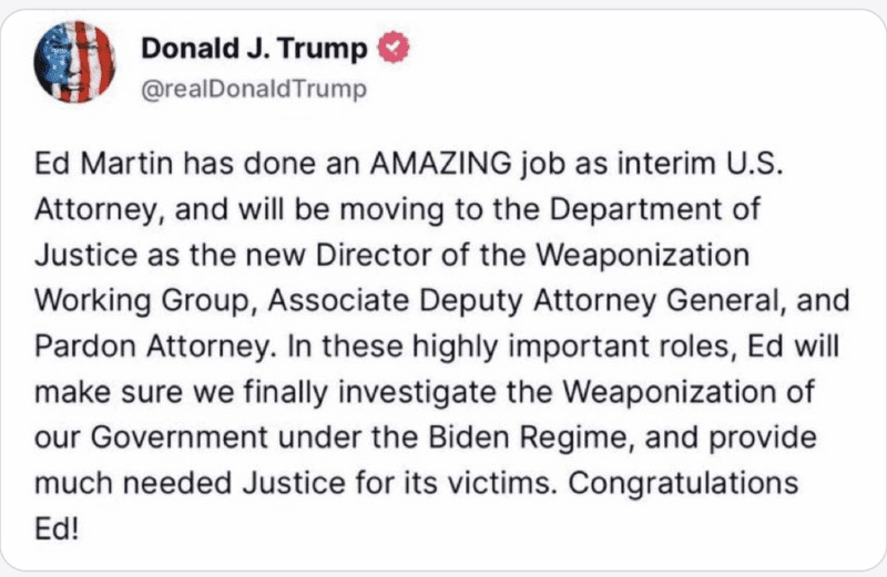 After backstabbing RINOs betrayed the party by refusing to vote for Trump’s pick for DC US Attorney’s office, Trump appointed Judge Jeanine Pirro and named Ed Martin. How’s that for making lemonade out of lemons? We’re still getting Ed Martin but now we get Judge Jeanine too. Martin was named to a senior DOJ position heading the investigation into Biden-era weaponization of the DOJ against conservatives.