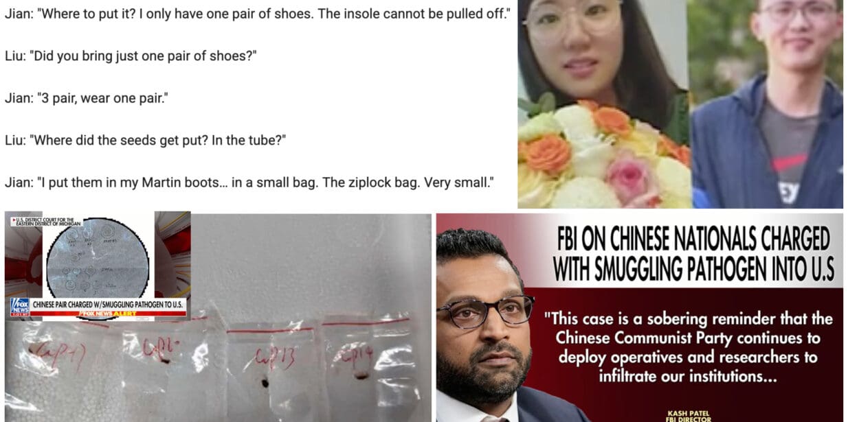 In he text exchange between the two Chinese nationals arrested in the agroterrorism, case,Yunqing Jian and Zunyong Liu is a 2022 WeChat conversation discussed smuggling the fungus Fusarium graminearum into the U.S. According to an FBI affidavit, Liu instructed Jian on how to conceal the pathogen, described as “Teacher Liang’s seeds,” in her shoes. Jian responded, “Where to put it? I only have one pair of shoes. The insole cannot be pulled off,” and later confirmed, “I put them in my Martin boots… in a small bag. The ziplock bag. Very small.” Liu replied, “That’s good… Just put it in your shoes.” This was part of an alleged plot to bring the crop-destroying fungus, classified as a potential agroterrorism weapon, into the U.S. for unauthorized research at the University of Michigan. Both were charged with conspiracy, smuggling, false statements, and visa fra