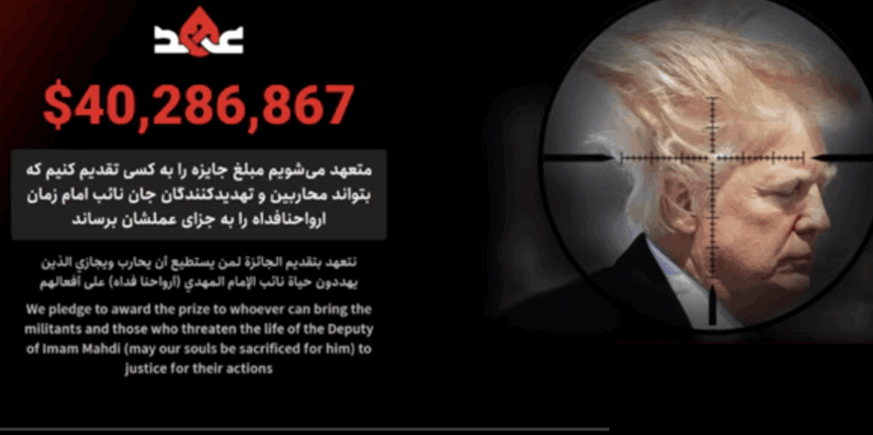 By: Adam Kredo. WFB<< July 11, 2025 An Iranian movement has reportedly raised more than $40 million for the assassination of President Donald Trump, as the country’s senior religious clerics make clear that "every cell of the resistance in the West is charged with carrying out this sentence." Iranian leaders recently issued two death warrants, or fatwas, against Trump and deemed him an "enemy of Allah" who must be killed. Those calls prompted the creation of a new organization dubbed the "Blood Covenant," which claims to have raised nearly $40.3 million for the president’s assassination, according to the Middle East Media Research Institute (MEMRI). The Blood Covenant operates "under the aegis of the Iranian regime" and poses a substantial threat to Trump given Tehran’s resources and coordination on the matter, according to MEMRI, which monitors jihadi movements in the region. "The fact that these calls to assassinate Trump are coming from above and being echoed in the street and through all strata of society, including in the Iranian media, underlines the depth and uniformity of the regime's institutional incitement," MEMRI wrote in its analysis. "It reflects a broad religious and regime consensus strengthened by reiterated emphasis of the reward anyone carrying out the punishment against Trump can expect to receive—in addition to the $40.3 million, also Paradise and the status of a defender of Islam." The Blood Covenant movement began on July 4 with the mission of defending "the jurisprudent leader," Iranian supreme leader Ali Khamenei. The state-controlled Fars News Agency, an affiliate of the Islamic Revolutionary Guard Corps, initially broadcast the "Blood Covenant" message. A senior State Department official told the Washington Free Beacon that the Trump administration is aware of these threats and is committed to "hold[ing] bad actors accountable." "This means using every tool at our disposal, including sanctions, to implement the president’s maximum pressure strategy," the senior official continued. The Blood Covenant published a poster on its website—which the Fars News Agency republished—depicting Trump in crosshairs and an award of up to $40 million for his assassination. "Strive with your wealth and your lives in the cause of Allah [jihad]," the poster reads, quoting a verse in the Quran. An English-language caption reads: "We pledge to award the prize to whoever can bring the militants and those who threaten the life of the Deputy of Imam Mahdi (may our souls be sacrificed for him) to justice for their actions. THIS CAMPAIN [sic] IS NOT FUNDING TERRORISM IT IS FUNDING THE FIGHT AGAINST US STATE TERRORISM." The website, registered to a domain inside the Islamic Republic, urged supporters to "bring this criminal Trump to justice" for his alleged threats against Khamenei. "I am satisfied with all my being and I will pay this amount with all my heart to someone who will bring this criminal Trump to justice for his actions so that it will be a lesson to those who threaten my dear leader, and know that we will sacrifice our lives for this path for my dear leader," one message on the site reads, among other notes. The assassination edicts primarily target "the younger generation of Muslims worldwide, exhorting them to act against Trump right now," MEMRI wrote. "The struggle is depicted not as a political clash but as an all-out religious war between Islam and the ‘leader of apostasy’ and the ‘enemy of Islam,’ and between the messengers of Allah and the enemies of Allah." Iran’s state broadcasting authority published a July 3 interview with Quranic expert Abdolmajid Kharqani in which he acknowledged that an "online campaign has been launched to fund the killing of Trump" and Israeli prime minister Benjamin Netanyahu. "There is an online fundraising campaign for the assassination of Trump and Netanyahu, and the sum collected is between $10 million and $20 million," Kharqani said in the interview, according to a translation performed by MEMRI. "This is so that whoever carries out this mission can kill these two individuals so that nobody in Iran will be harmed any more. The scene must be made unsafe for them. Islamic law determines that the leaders of unbelief must be killed. This is a religious obligation incumbent upon every Muslim." Iranian religious figures at the Howza-e Ilmiyya Seminary offered support for the two death fatwas on Trump, saying on July 2 that the president’s "blood is permitted." Another religious lecturer at the seminary, Amin Asadpour, declared Trump and Netanyahu the enemies of Muslims worldwide and their deaths permissible. "All the cells of the resistance, all the Muslims in the Islamic world, and even those in the Western countries are obligated to implement the ruling concerning muharebs against Netanyahu, against the plundering State of Israel, against U.S. President [Donald Trump], and against the U.S. government," Asadpour said in a July 1 speech translated by MEMRI.