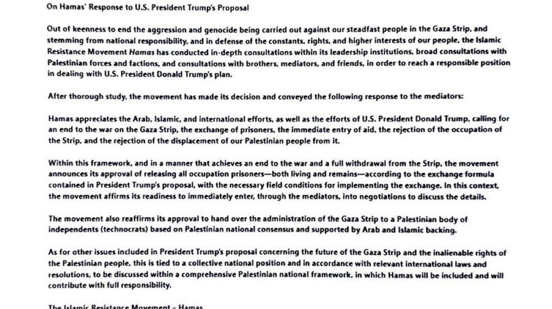 Here is the response HAMAS sent to President Trump about his proposed peace deal. @WhiteHouse tweeted it, but then deleted it. pic.twitter.com/N02RRoX0lZ