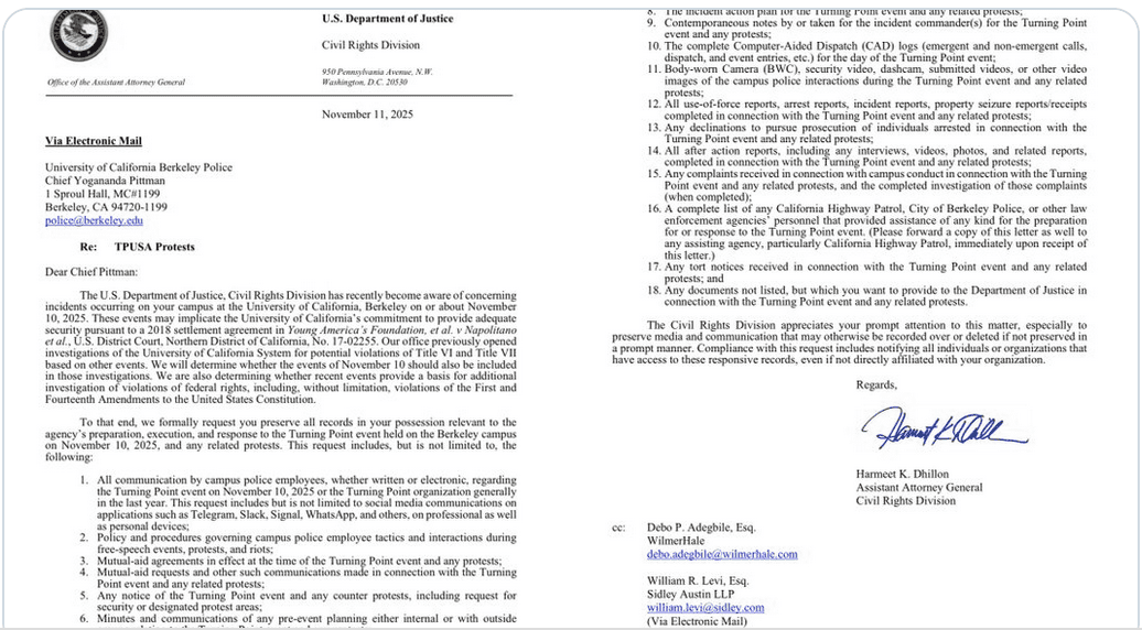 Harmeet Dhillon of the Department of Justice: Our office previously opened investigations of the University of California System for potential violation of Title VI and Title VII based on other events. We will determine whether the event of November 10 should also be included in those investigations. We are also determining whether recent event provide a basis for additional investigation of violation of federal rights, including, without limitation, violations of the First and Fourteenth Amendments to the United States Constitution….. The Civil Rights Division appreciates your prompt attention to this matter…. (Dhillon).