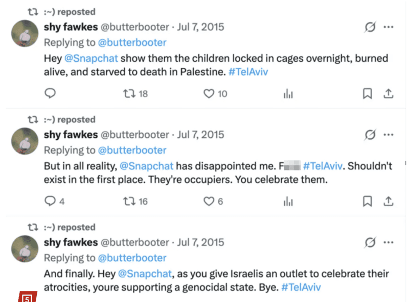 In one 2015 post, she raged that Tel Aviv “shouldn’t exist in the first place,” calling its residents “occupiers,” and dropped the N-word in another post two years earlier.On her now-inactive Tumblr, she hailed Palestinian plane hijacker Leila Khaled and members of the Popular Front for the Liberation of Palestine, while reposting a tirade accusing US service members of “mercilessly slaughtering 3rd world civilians” to maintain “American hegemony.”