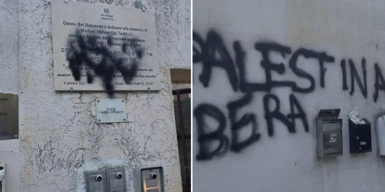 The walls of a Rome synagogue and a plaque dedicated to the memory of a two-year-old victim of terrorism were vandalized, Italian Jewish organizations reported on Monday.