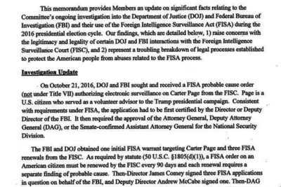 “Andrew McCabe confirmed that no FISA warrant would have been sought from the FISA Court without the Steele dossier information.” The four-page document shows senior FBI agents and Department of Justice officials used the Clinton-financed ‘Trump Dossier’ as the cornerstone of FISA court orders that allowed them to spy on “at least one” senior Trump associate in the run-up to the 2016 presidential campaign.